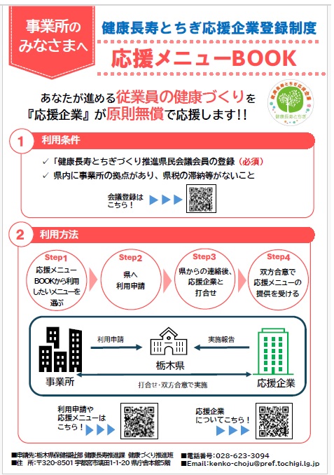 『応援企業』は、事業所の健康づくりを応援するための各種応援メニューを原則無償で提供します。